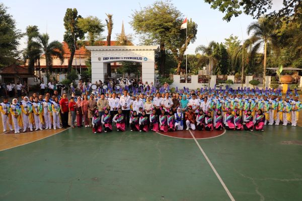Acara pelepasan berlangsung meriah dengan penampilan spektakuler Marching Band Gita Swarna Spero di halaman SMP Negeri 2 Purworejo, Rabu (8/10/2025).