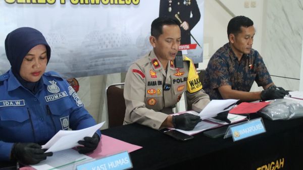Kegiatan konferensi pers tersebut dipimpin langsung oleh Wakapolres Purworejo, Kompol Nana Edi Sugito, S.H., dengan didampingi Kasat Reskrim AKP Dwiyono, S.H., M.H., serta Kasi Humas AKP Ida Wida Astuti, S.H., M.A.P.